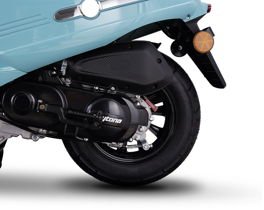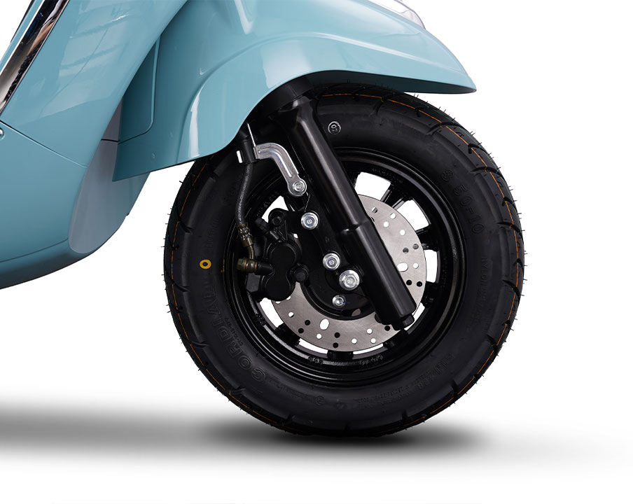 Το μπροστινό δισκόφρενο 180mm με διπίστονη δαγκάνα προσφέρει αμεσότητα στην πέδηση, ενώ το πίσω ταμπούρο διασφαλίζει προοδευτικό φρενάρισμα και αξιοπιστία σε κάθε διαδρομή.