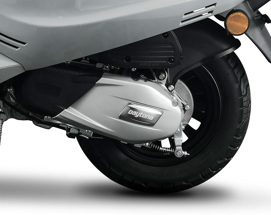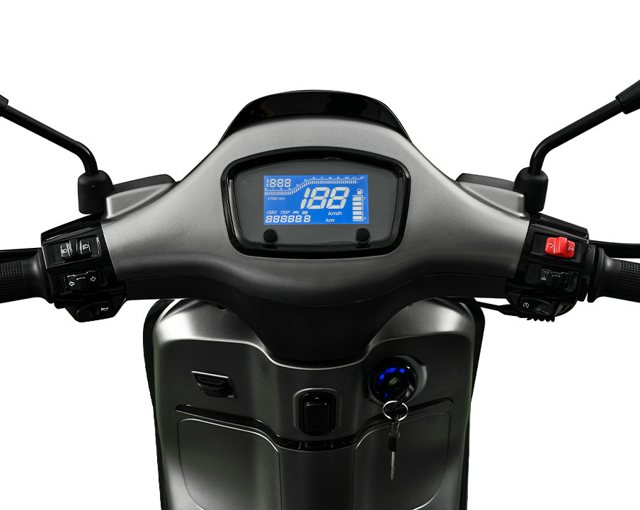 Ο ψηφιακός πίνακας οργάνων LCD της DAYTONA DONNA 125 προσφέρει ευκρινή απεικόνιση των πληροφοριών. Στο κέντρο προβάλλεται η μεγάλη ψηφιακή ένδειξη ταχύτητας, ενώ πάνω από αυτήν βρίσκεται το στροφόμετρο σε γραμμική διάταξη. Στο κάτω μέρος εμφανίζονται οι ενδείξεις του ολικού και μερικού χιλιομετρητή (ODO/TRIP), ενώ η στάθμη καυσίμου απεικονίζεται στη δεξιά πλευρά. Στην κορυφή αριστερά υπάρχει ψηφιακό ρολόι, προσφέροντας ολοκληρωμένη πληροφόρηση στον αναβάτη. Ο μπλε φωτισμός του προσδίδει μοντέρνο χαρακτήρα και ενισχύει την ορατότητα σε όλες τις συνθήκες φωτισμού.
