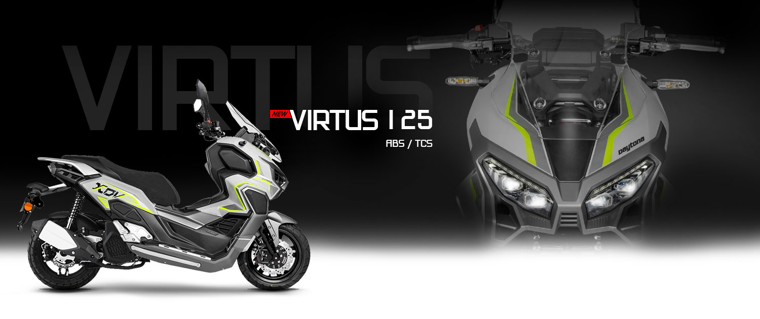 Ο δυναμικός σχεδιασμός του Virtus αντανακλά πλήρως τη φιλοσοφία κατασκευής του, με επιθετικές γραμμές που συμπληρώνονται από τους LED προβολείς, οι οποίοι ακολουθούν την πολυεπίπεδη αρχιτεκτονική της μπροστινής όψης του scooter, ενώ παράλληλα προσφέρουν μια φυσική δέσμη. Επιπλέον, το Virtus διαθέτει προεγκατάσταση για τοποθέτηση προβολέων ομίχλης.