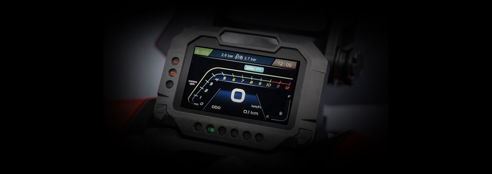Η TFT οθόνη 5″, με σύγχρονο γραφικό περιβάλλον και υψηλή ευκρίνεια, συγκεντρώνει με μια ματιά όλες τις βασικές πληροφορίες, συμπεριλαμβανομένων των ενδείξεων πίεσης ελαστικών μέσω TPMS.