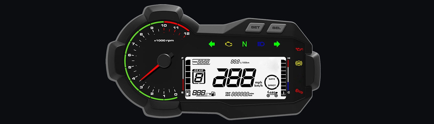 Ολικό/Μερικό Χιλιομετρητή | Ένδειξη Σχέσης Ταχύτητας | Ειδοποίηση Συντήρησης | Δείκτη Θερμοκρασίας Ψυκτικού Υγρού Κινητήρα | Ένδειξη Λειτουργίας ABS | Ένδειξη Λειτουργίας Safe/Sport | Κατανάλωση | Υπολειπόμενη Αυτονομία.