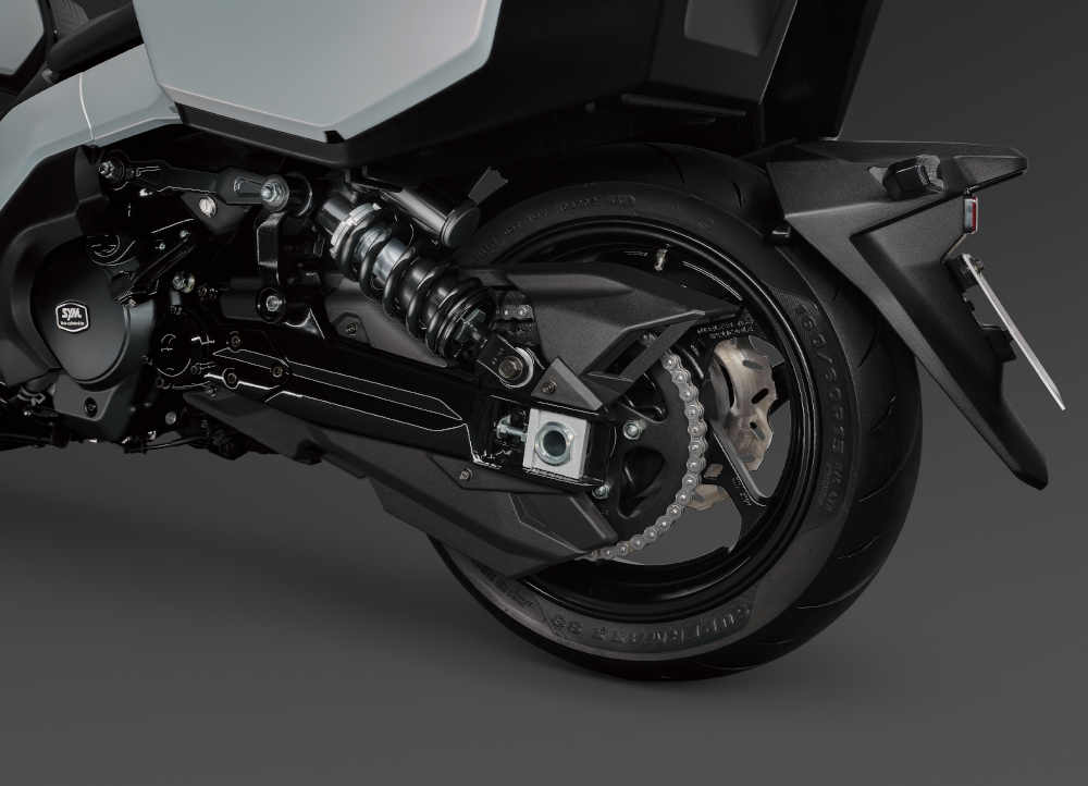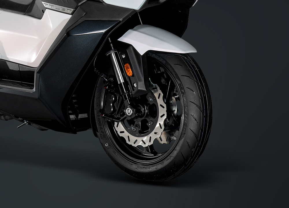 Το στιβαρό Upside Down πιρούνι 41 mm, που δένει στον λαιμό του πλαισίου με διπλές πλάκες, αυξάνει την ακαμψία και την ακρίβεια στην οδήγηση. Τα ελαστικά Maxxis Supermaxx S3, με τη σύγχρονη τεχνολογία “HDFS FULL-SILICA”, θερμαίνονται γρήγορα και προσφέρουν εξαιρετική πρόσφυση. Σε διαστάσεις 120/70-15 μπροστά και 160/60-15 πίσω, εξασφαλίζουν σταθερότητα και σιγουριά σε γρήγορο ρυθμό.