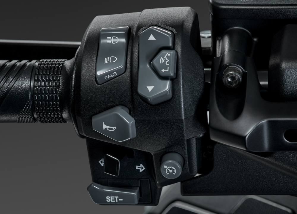 Όλες οι βασικές λειτουργίες συγκεντρώνονται στο αριστερό χειριστήριο: φώτα, φλας, κόρνα, ρυθμίσεις της TFT οθόνης και cruise control. Με το πάτημα των πλήκτρων SET/RES ο αναβάτης ρυθμίζει ή μεταβάλλει την επιλεγμένη ταχύτητα ταξιδιού.
